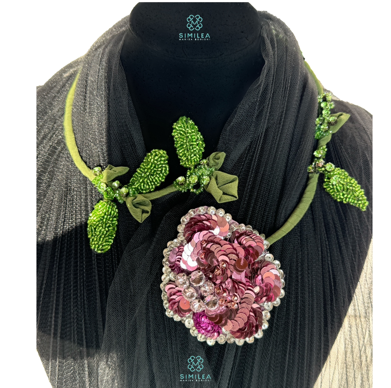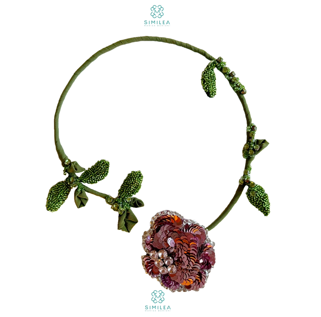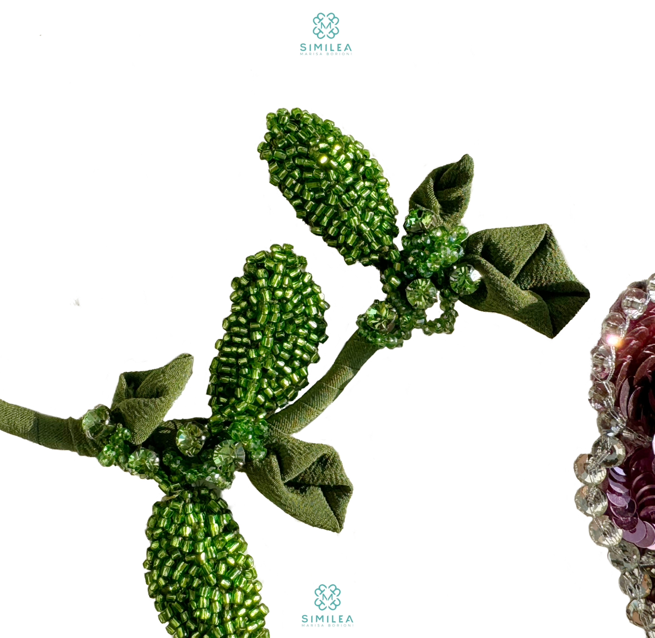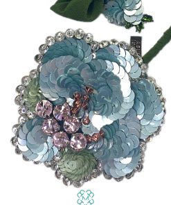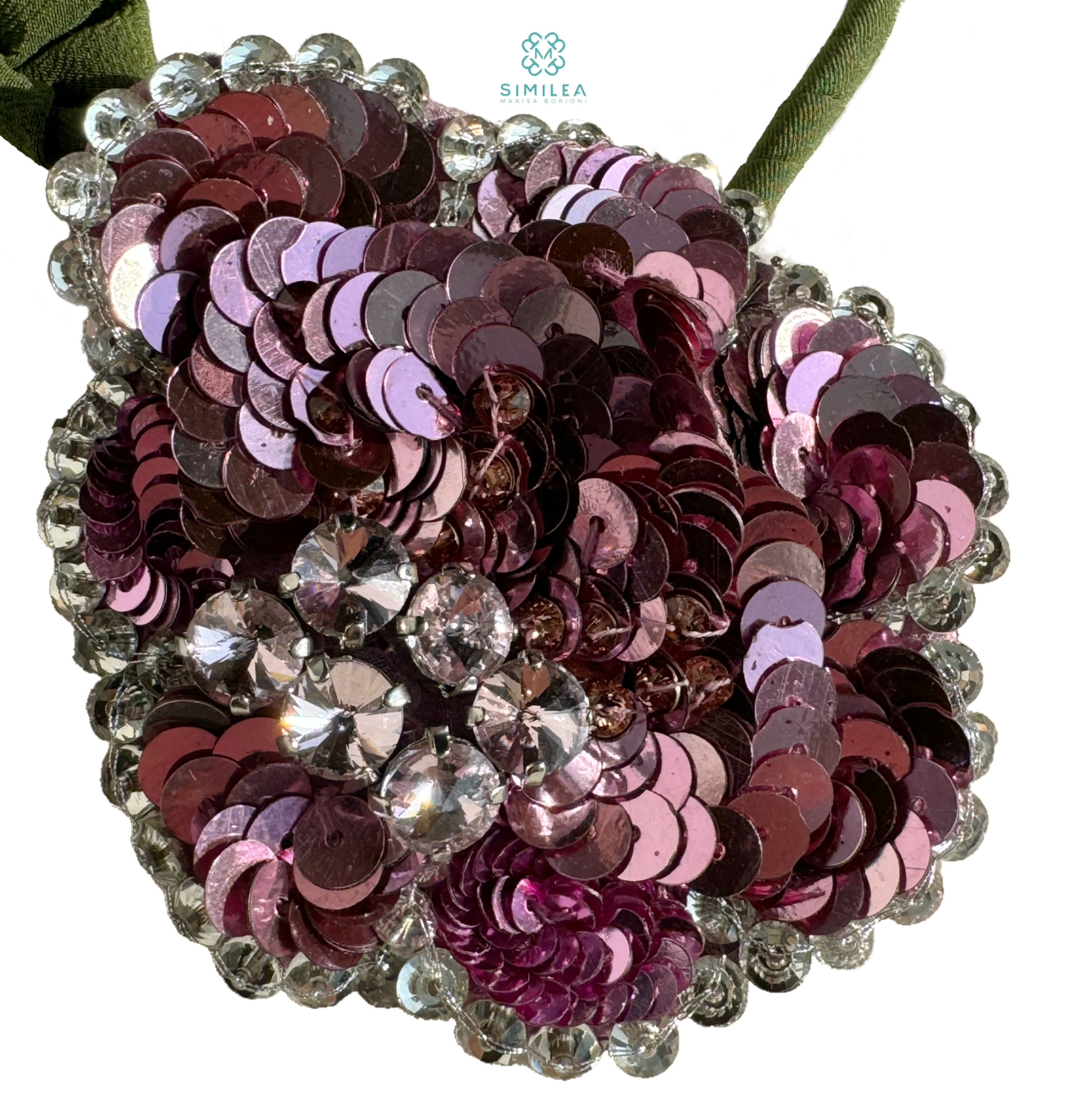 Realizzata con l’anima in metallo e con un fiore brillante ricamato con paillettes metallizzate ed impreziosito con strass e perline. Le foglie sono ricamate con micro perline verdi.