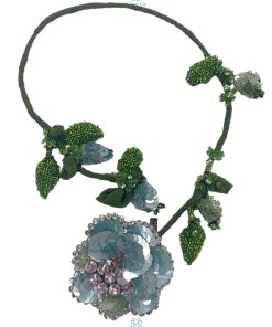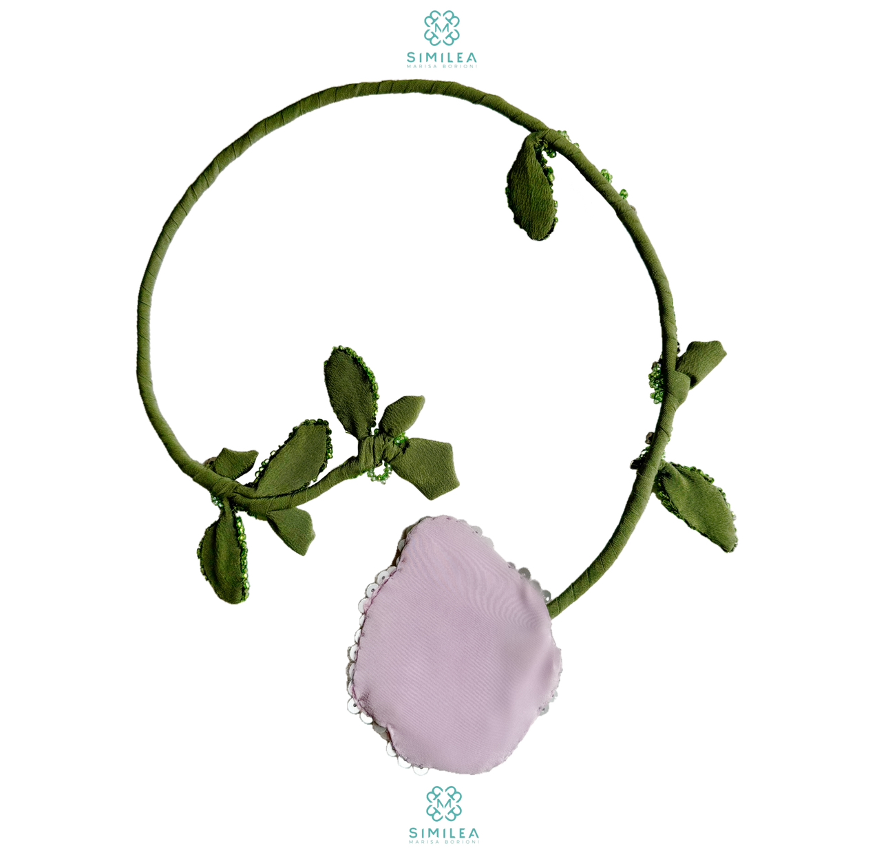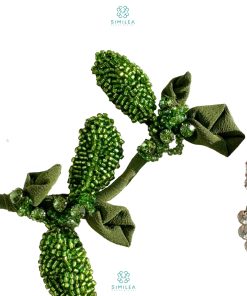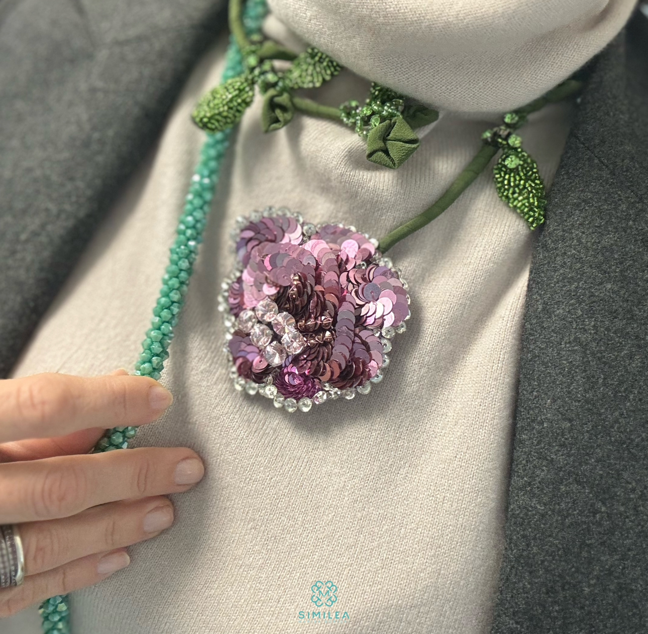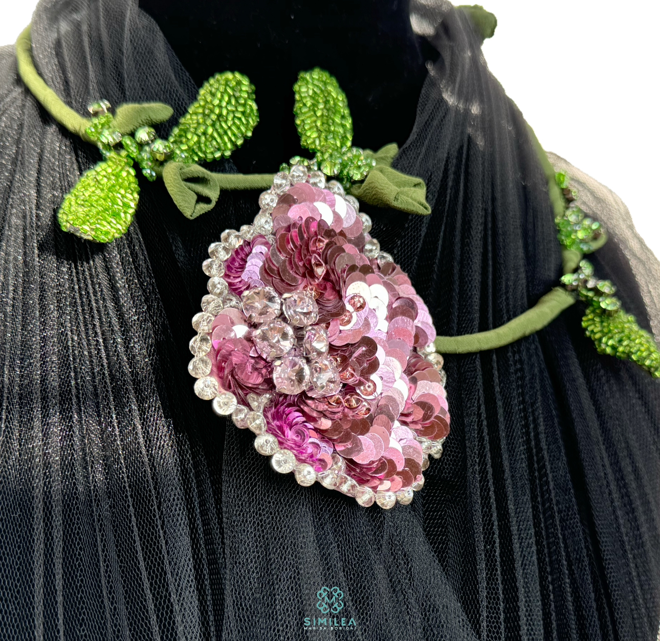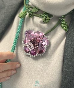 Realizzata con l’anima in metallo e con un fiore brillante ricamato con paillettes metallizzate ed impreziosito con strass e perline. Le foglie sono ricamate con micro perline verdi.